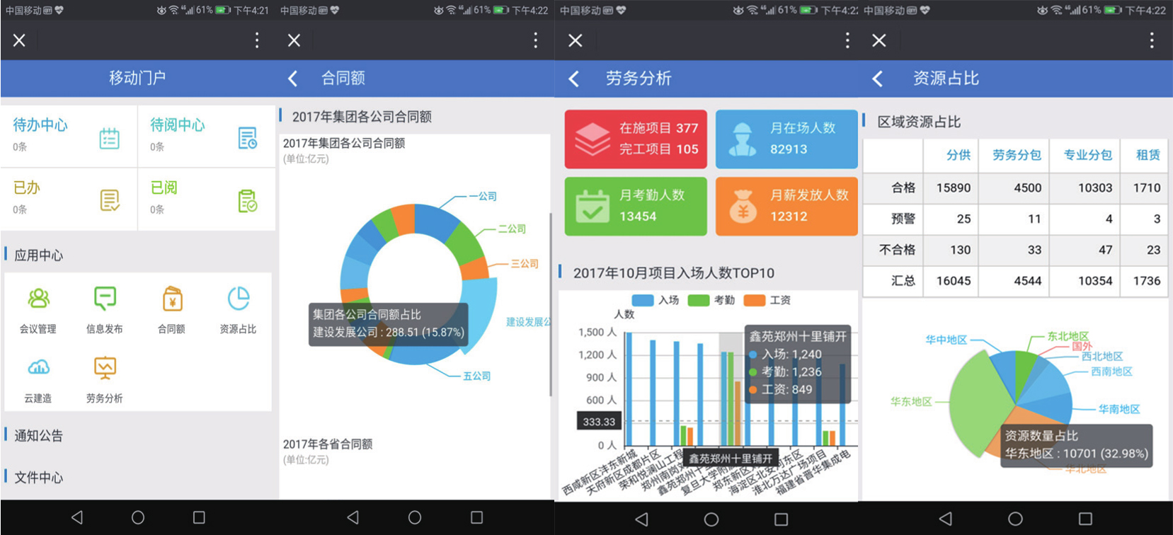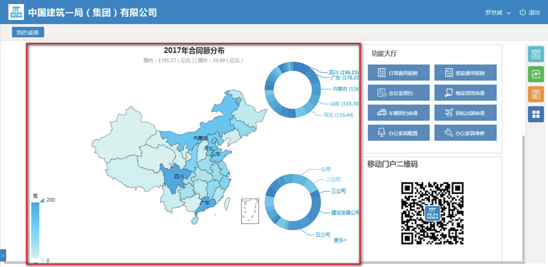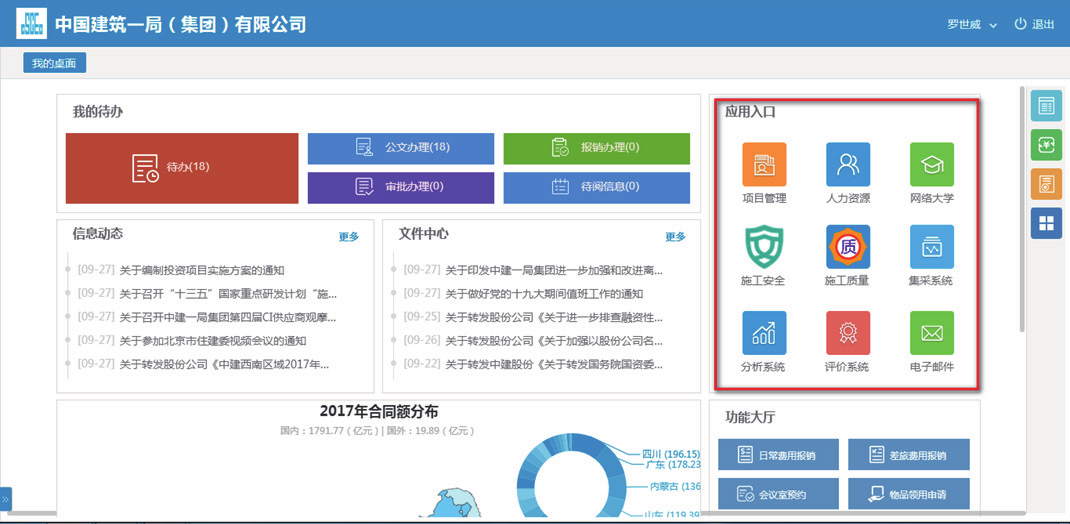 中建一局在 2007 年与金沙9001以诚为本合作,部署实施了协同办公平GLinkWorks4.3,随着信息技术的发展及公司业务的需要,在 2017 年升级到了 GLinkWorks7.0。并在此基础之上,依托金沙9001以诚为本提供的“协同 +”能力将各业务系统连接,以OA 组织架构为先决条件实现了单点登录、代办聚合、功能聚合;基于异构系统数据库统一,实现数据整合及业务应用为一体。通过异构系统的数据库开放,门户系统将各业务系统重点数据钻取、分析、统计,所生成结果以报表形式展现在各级门户上,同时结合 PC 端移动端数据同源,实现了随时随地随手办公的效果。真正为员工提供了快速发起通道,为辅助领导决策提供了有力支撑,最终实现集中管控业务、提供市场核心竞争力。