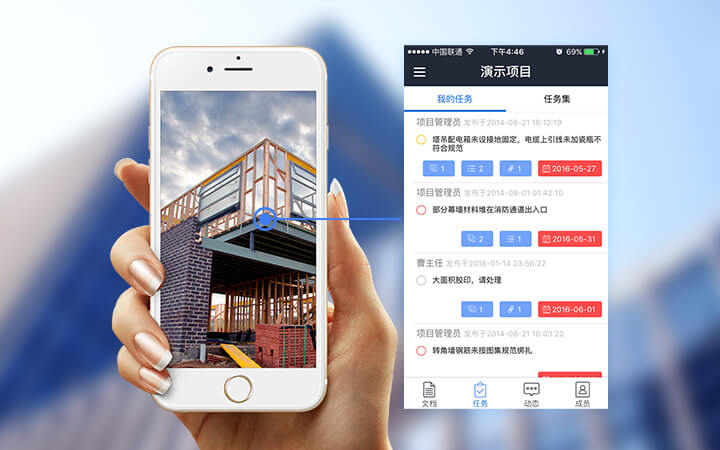 随时随地移动办公4、施工现场、外地出差随时随地查看图纸模型、技术资料等,拍照上传问题,及时任务处理。具体功能含:工程文件便捷分享至QQ微信、问题拍照、项目通讯录方便联络成员、消息即时提醒。 |