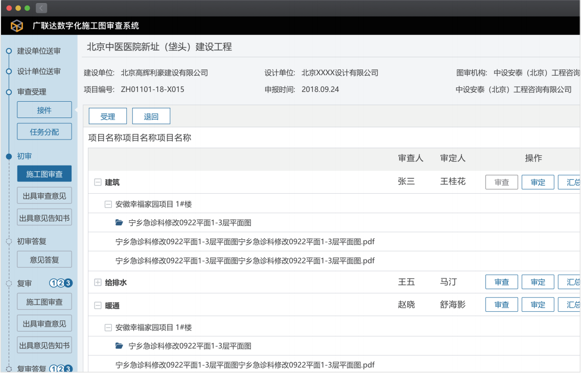 提供统一、规范、完整的施工图技术审查及工作管理平台,构建了先申报后选择、 机选摇号、同体回避、工作量管控、申诉评价等全面的机构遴选管控模块,为政府买服务方式开展施工图审查工作提供了规范、便捷、有效的系统支撑。能够与报建平台无缝对接,实现行政审批与技术审查的全过程打通;提升审批和监管的及时性、有效性、准确性,为进一步压缩工程建设项目审批总时限提供有效技术支撑。