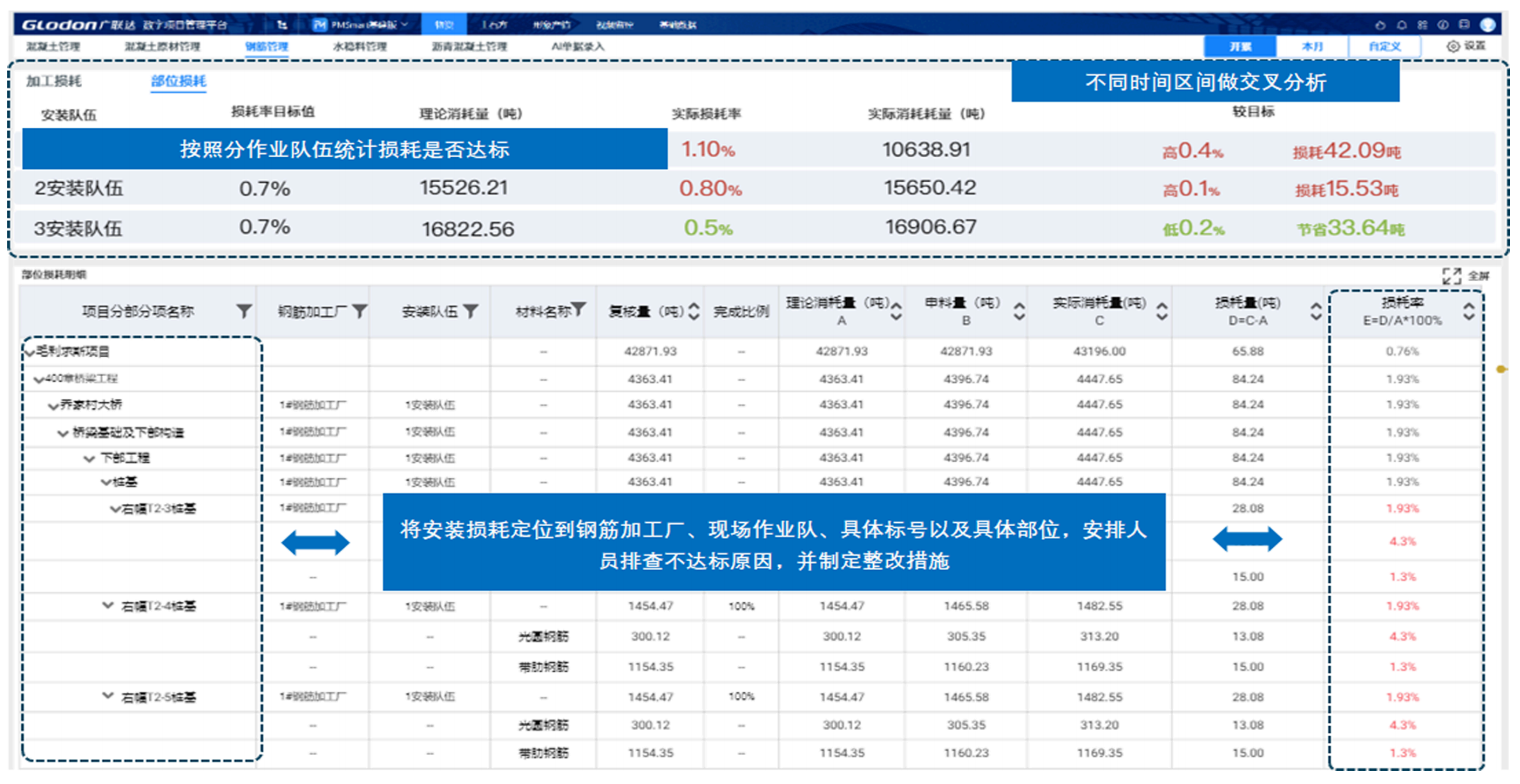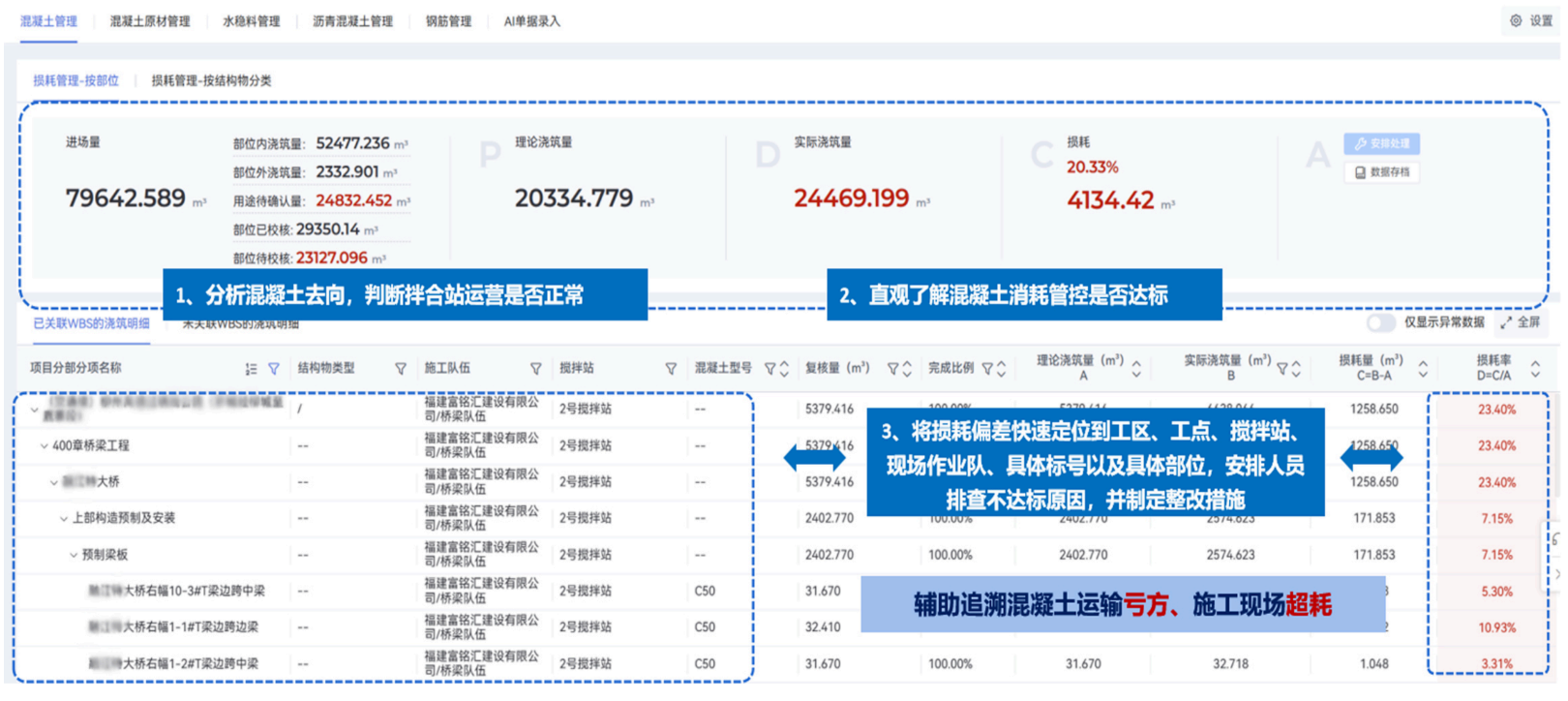 产值计量管理自动统计进度、计算产值,效率提升10倍以上;跟踪已完未计工程量,计量率提升2% PMSmart通过复用混凝土浇筑进度,对接无人机路基收方数据,自动计算项目主体形象进度与产值,统计工作效率提升10倍以上;实时跟踪构件完工质量资料节点,对比已计数据,对应计未计构件做预警,规避漏计、 错计,提升项目计量率 |