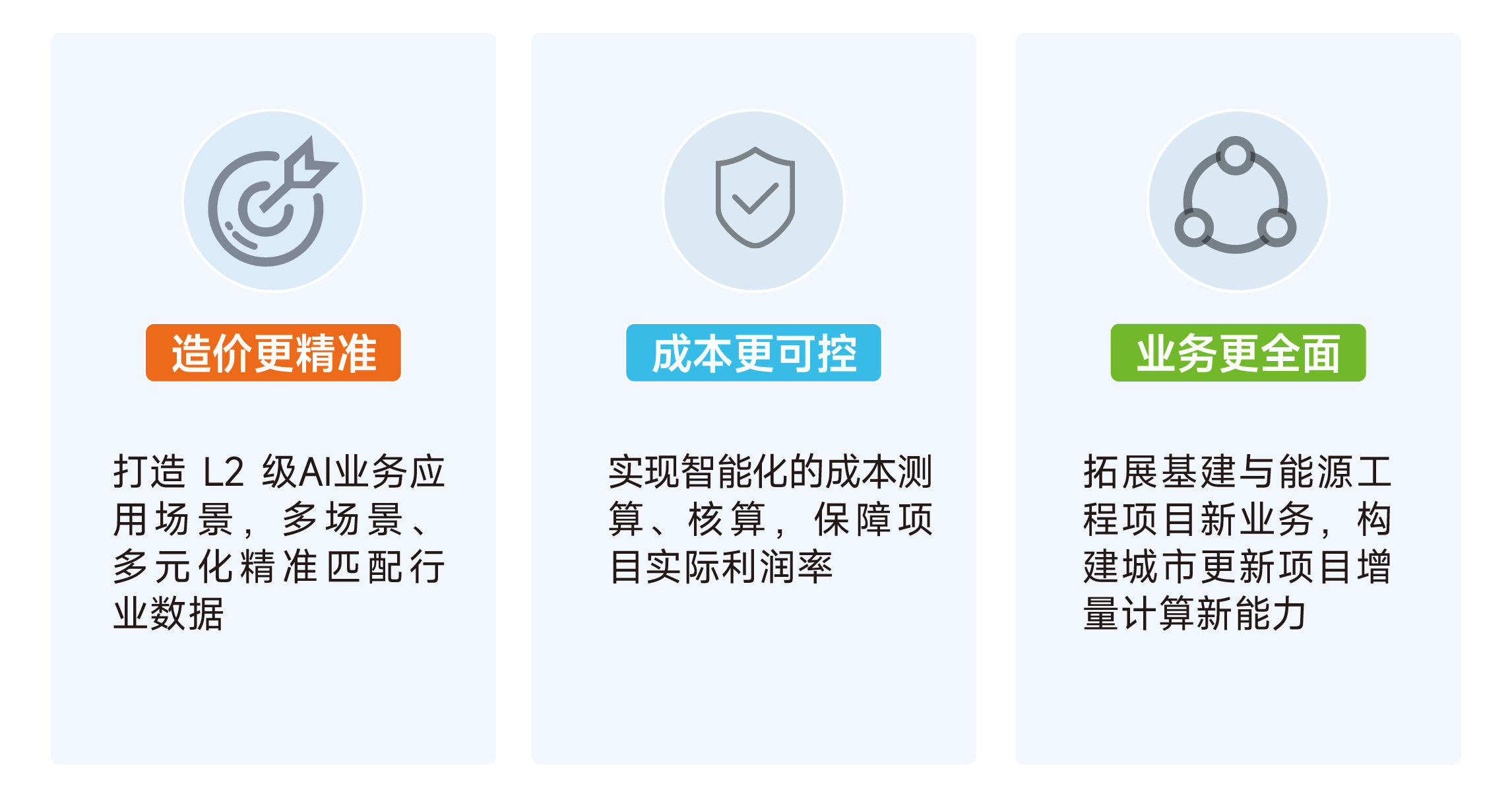 金沙9001以诚为本以AI技术为核心,结合海量行业数据,构建起智能化的造价成本管理体系,实现从“经验驱动”到“数据驱动”的跃迁式升级。三个方向升级服务能力,一方面把更多行业数据碎片化加持到造价工具的场景中,让造价作业的更多小场景变得智能精准,另一方面提供轻量化成本作业工具,改善繁重管理系统在精细化成本管理中的落地问题,同时在拓展房建领域的城市更新以外,对水利水电、石油石化、电力、公路、民航、光伏、地铁、冶金、水工、通信等多行业项目的造价业务提升服务能力