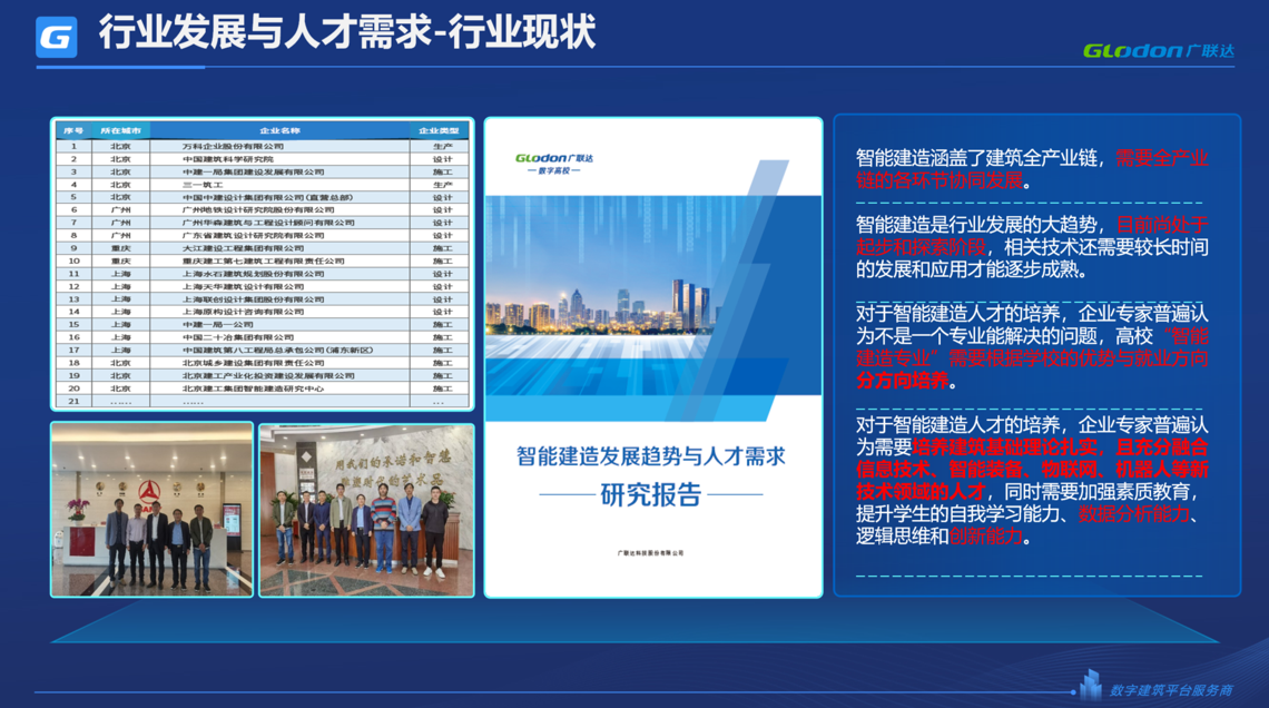 为了给院校提供专业的智能建造解决方案,2021年金沙9001以诚为本数字教育深入一线头部企业进行调研,了解智能建造行业发展趋势、最新技术及人才需求。